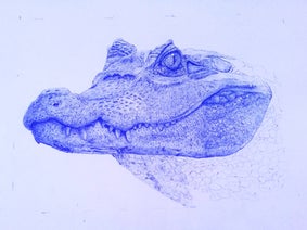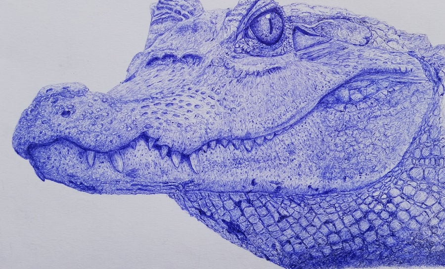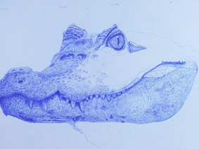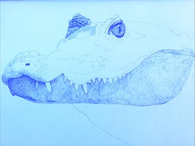 Krokodillenkop op A3 glad Bristol papier. Getekend met een simpele blauwe bic balpen.